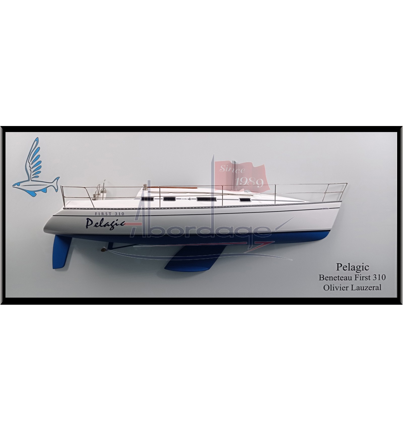 Check this imposing custom half model with deck details of the Beneteau First 310 built upon request at scale 1/24 on a modern white backboard.