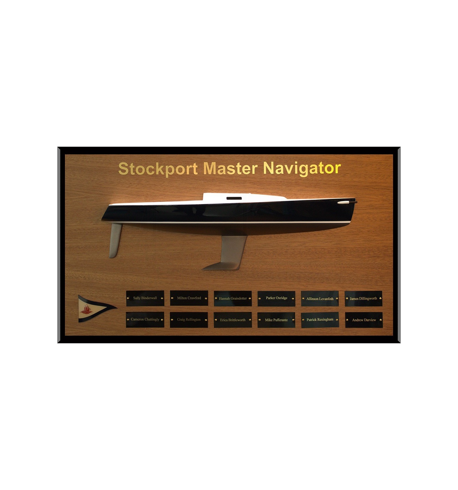 See this handsome trophy of the J-100, built upon request at scale 1/24 or 17 inches LOA., with your yacht club burgee, brass plates and golden title.